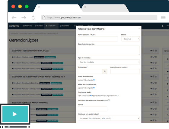 Realize transmissões em tempo real com seus alunos, com datas pré-agendadas, compartilhe webcam, áudio, chat, sua tela e documentos, tudo isso com uma interface fácil de utilizar e acessar, a integração do zoom.us com a Plataforma LMS Estúdio, veio para facilitar a criação de web conferências e lives em seus cursos. Disponível somente a assinantes do LMS.